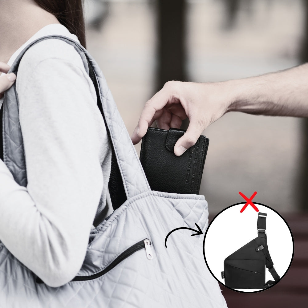 La sua chiusura anti-furto con zip nascoste e sistemi di blocco integrati protegge efficacemente portafoglio, smartphone, documenti e altri oggetti personali dai borseggiatori.